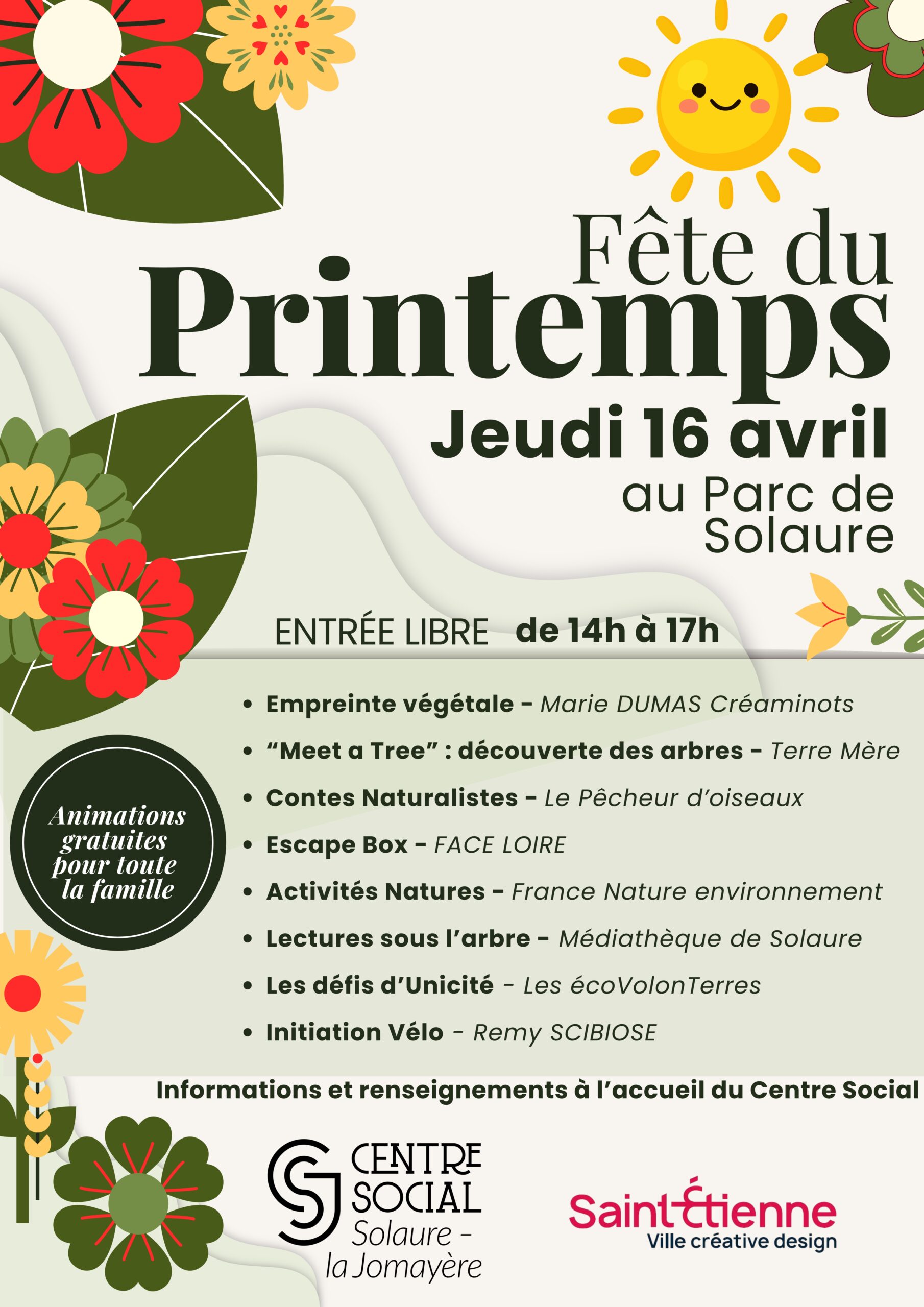 Rendez-vous le jeudi 16 avril au Parc de Solaure de 14h à 17h pour des animations gratuites ! Au programme : atelier création avec empreinte végétale, balade contée avec le Pëcheur d’oiseaux, escape Box, activités natures, lecture sous les arbres, initiation vélo,…